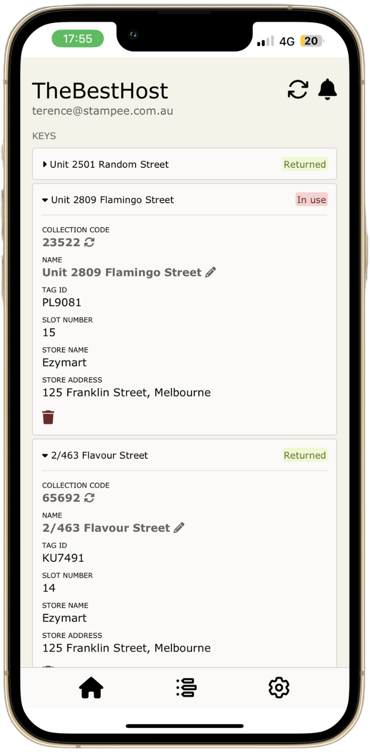 Hosts can track the live movement of their keys via our web application, installable on iOS and Android as a progressive web app. See